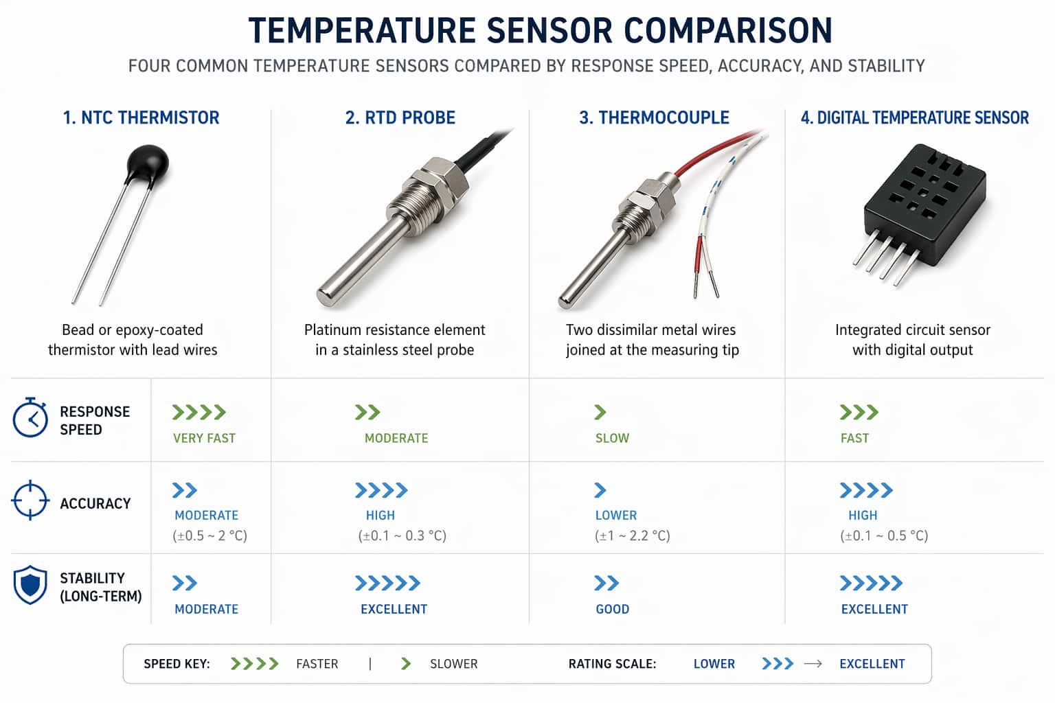 Sensor Type Accuracy Response Stability Cost Typical HVAC Use